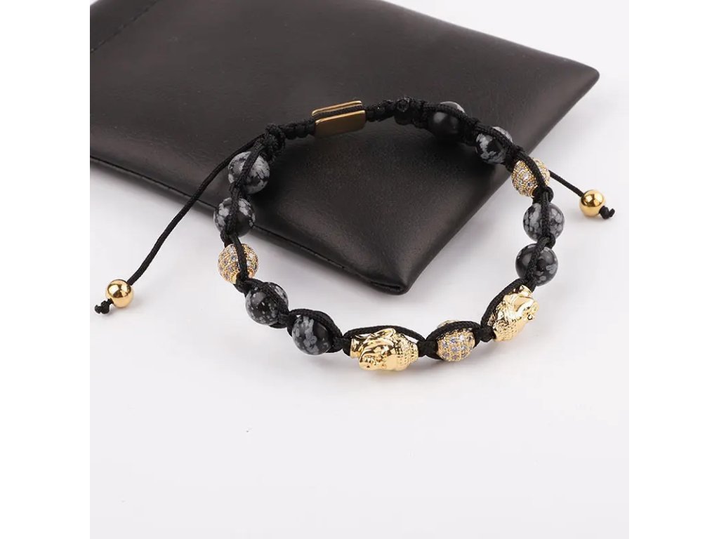 - Hlava Buddhy, kuličky stahovacích šňůrek a spona je z pozlaceného obecného kovu.