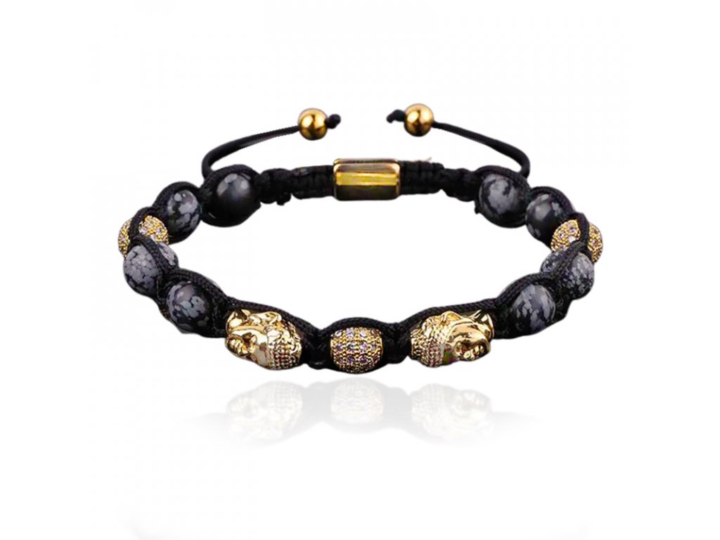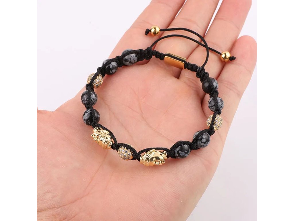 - Přírodní leštěné minerály s tmavě šedým a černým žíháním tvoří zbývající korálky Buddha náramku.