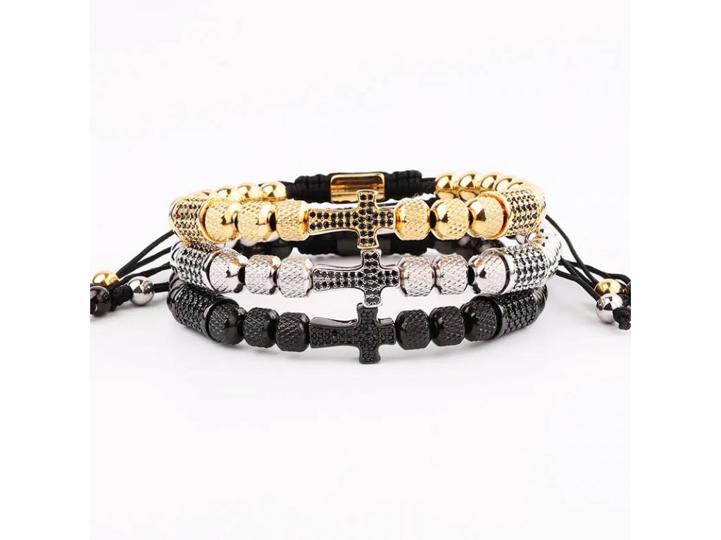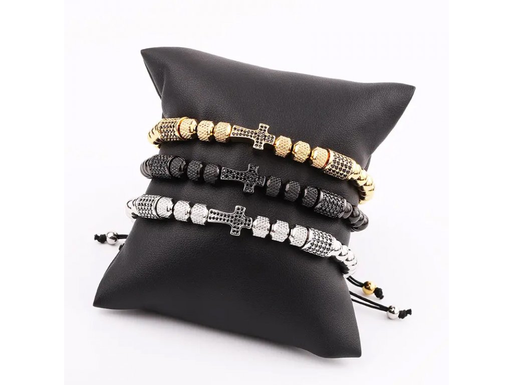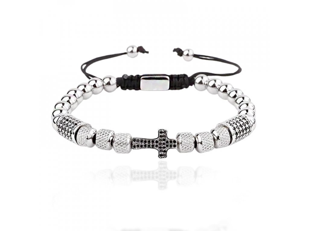 - Křížek a další dva korálky ve tvaru válečku jsou osázeny černými kulatými kubickými zirkony s briliantovým brusem.