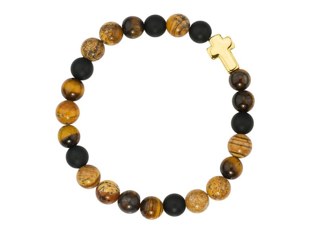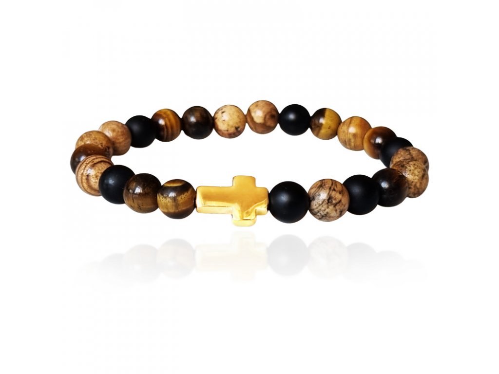 - Elegantní a harmonické spojení přírodního kamene s pozlaceným kovovým křížem tvoří design našeho korálkového náramku.
