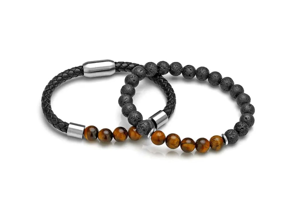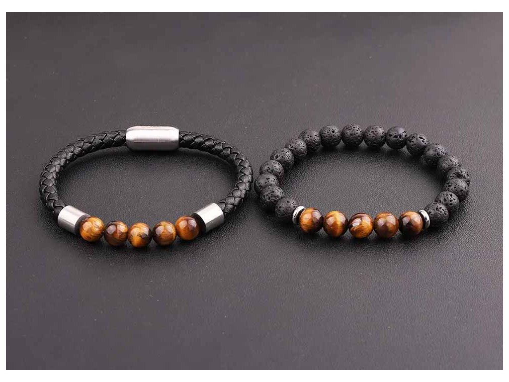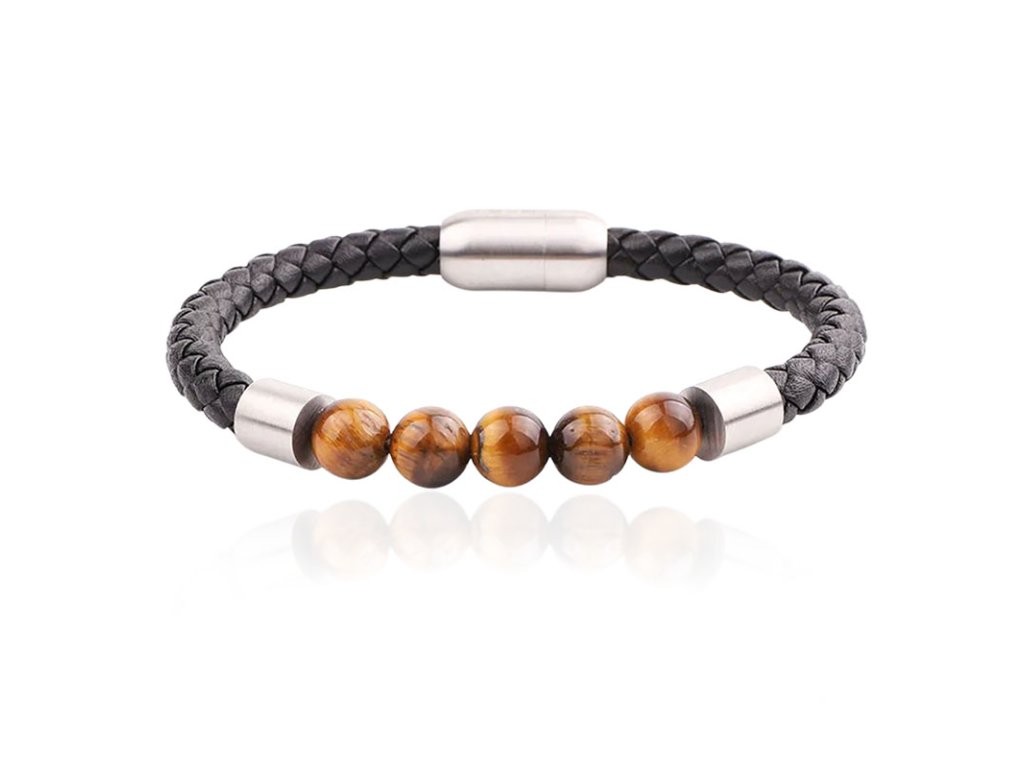 Korálkový náramek Tiger Eye & Leather +Dárková krabička zdarma
