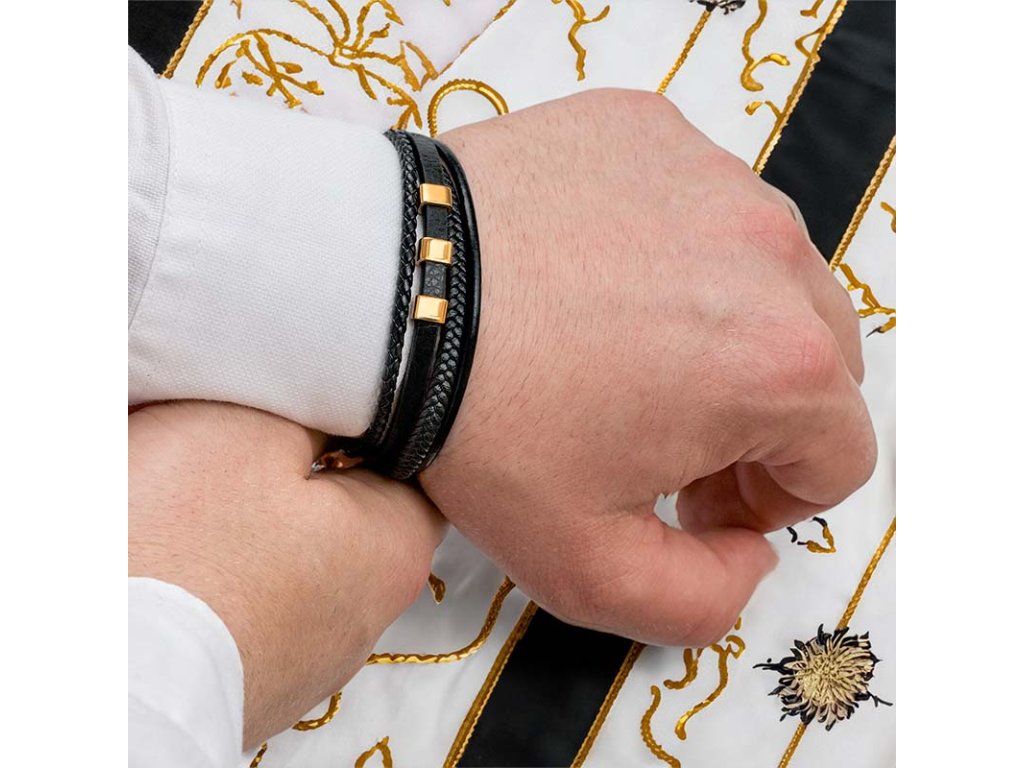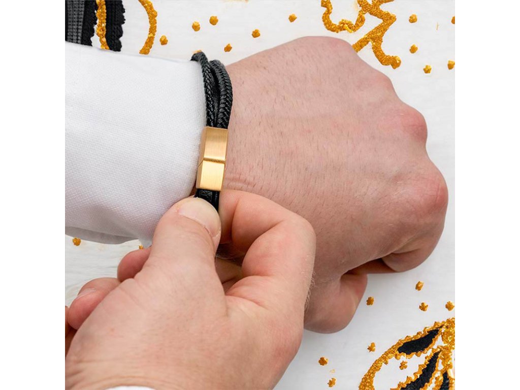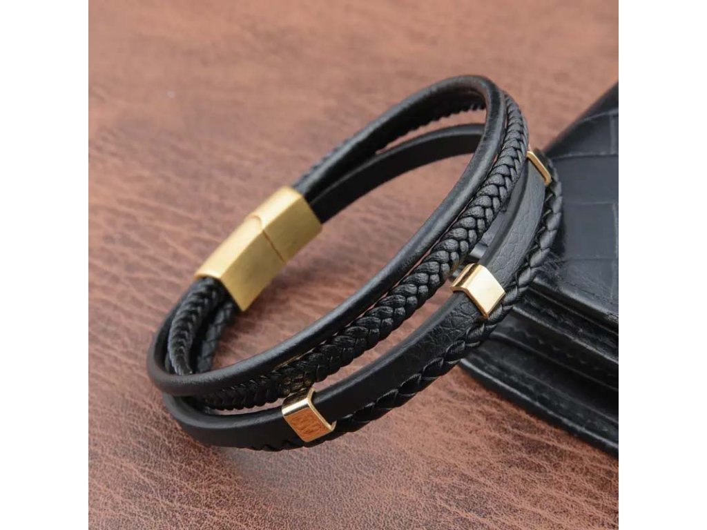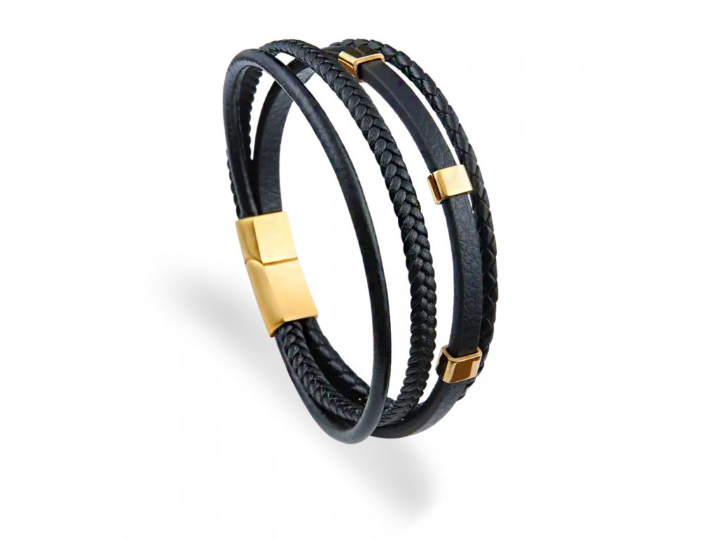 - Originální černý kožený náramek doslova rozsvěcí pozlacené kovové zapínání a ozdoby.