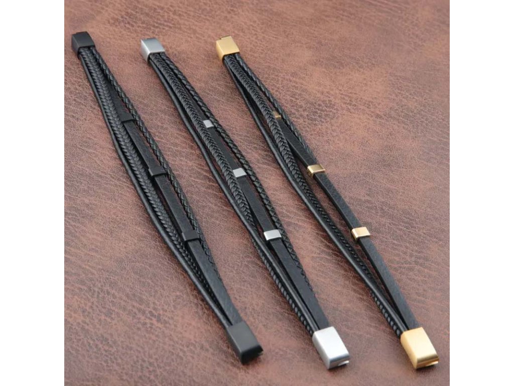 - Náramek se skládá ze tří kožených řemínků a jedné kožené šňůrky.