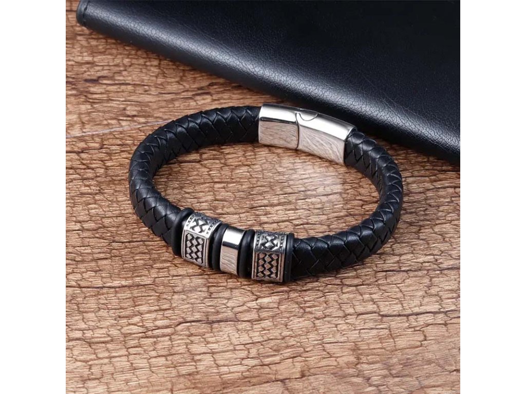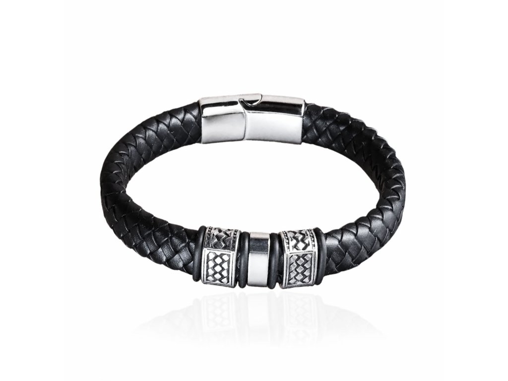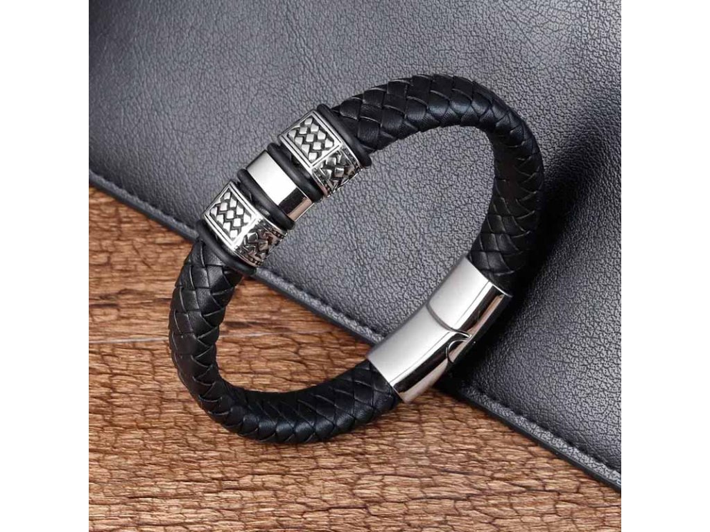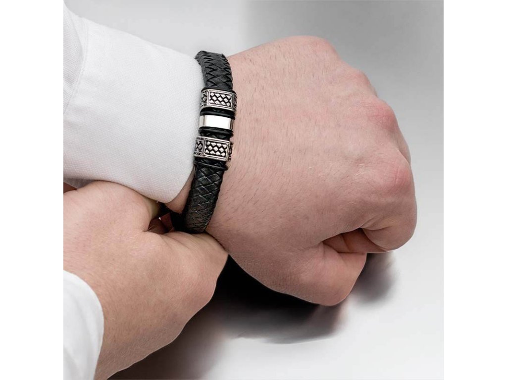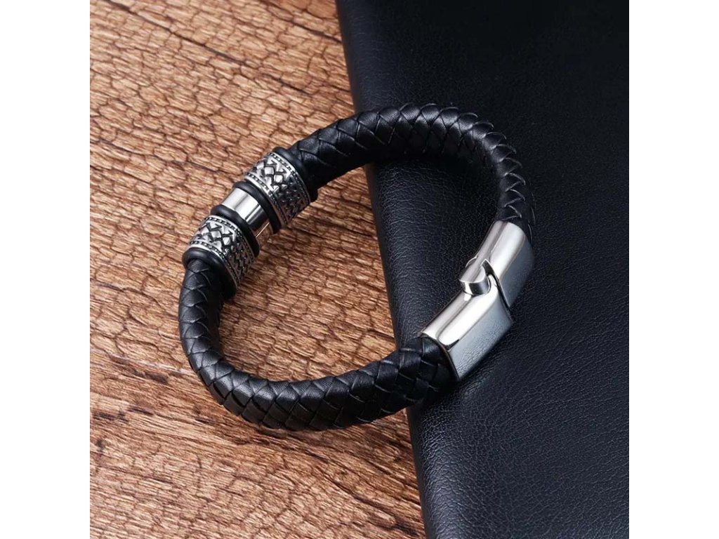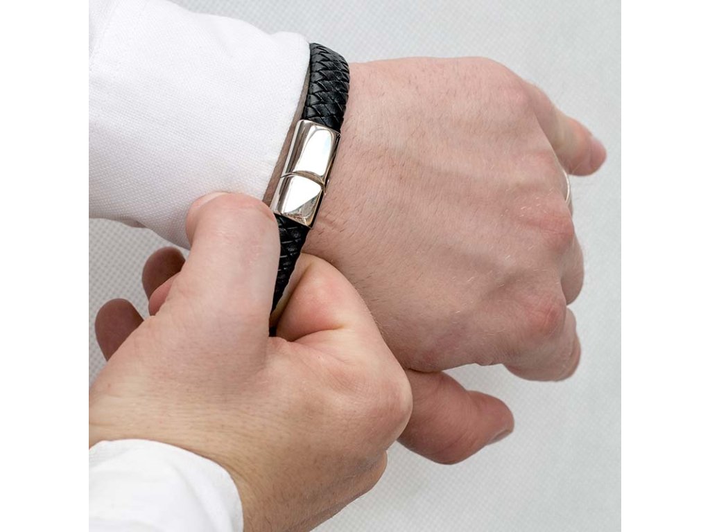 - Korpus náramku tvoří černé matné kožené proužky, které jsou vzájemně propletené.