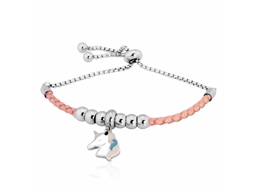 - Mezi šesti navlečenými kovovými korálky je ocelový kroužek s přívěskem bílého jednorožce s šedo-modrou a světle růžovou hřívou.