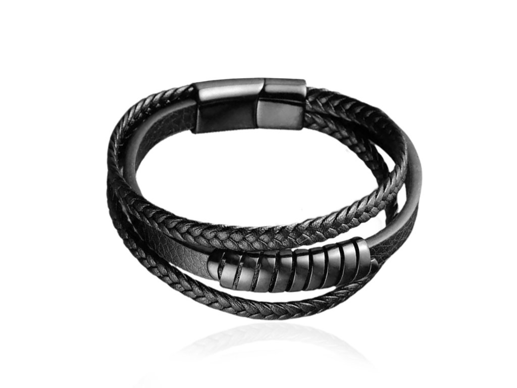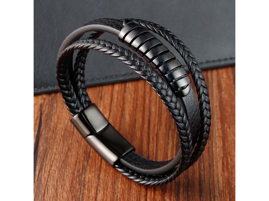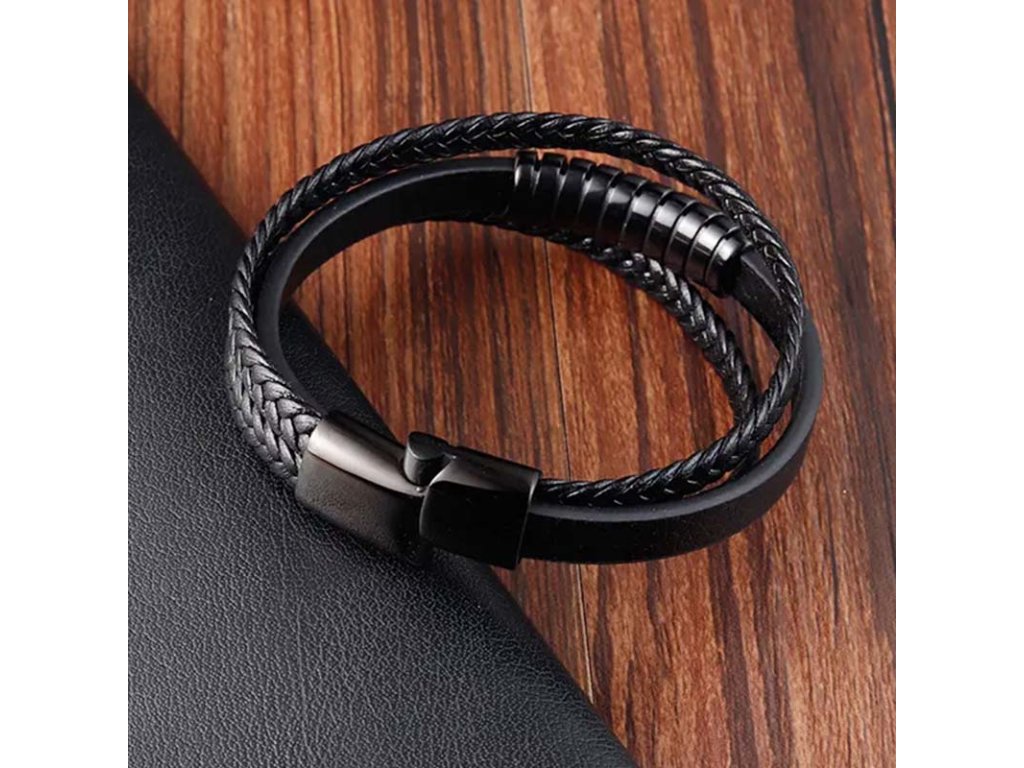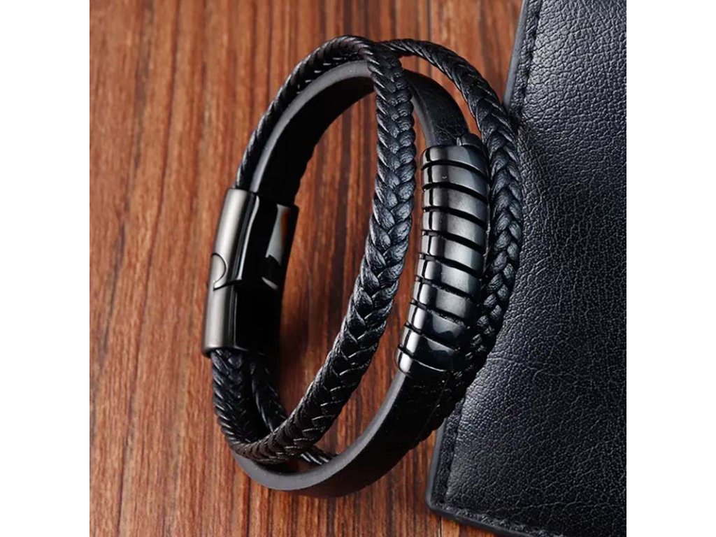 Kožený náramek Snakey Black chirurgická ocel +Dárková krabička zdarma