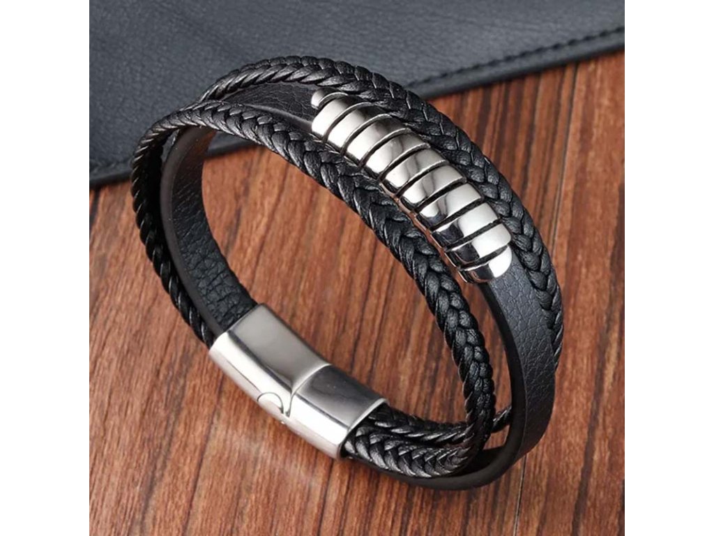- Náramek je vytvořen ze tří kožených řemínků.