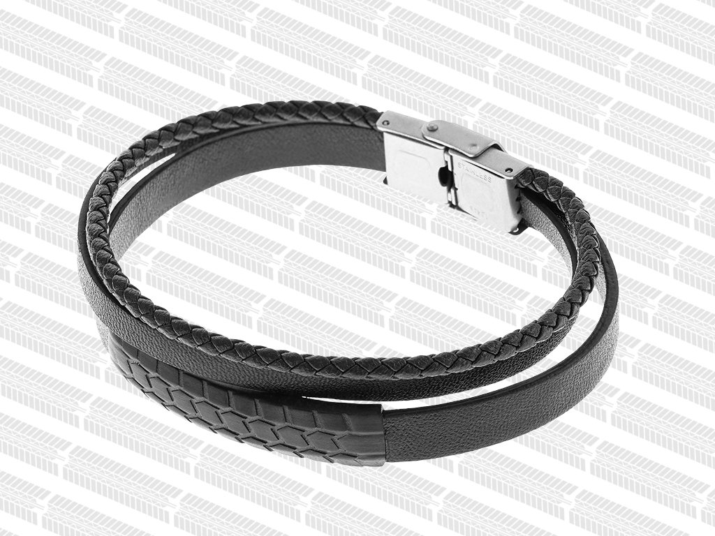 Kožený náramek Tire Track Black chirurgická ocel +Dárková krabička zdarma