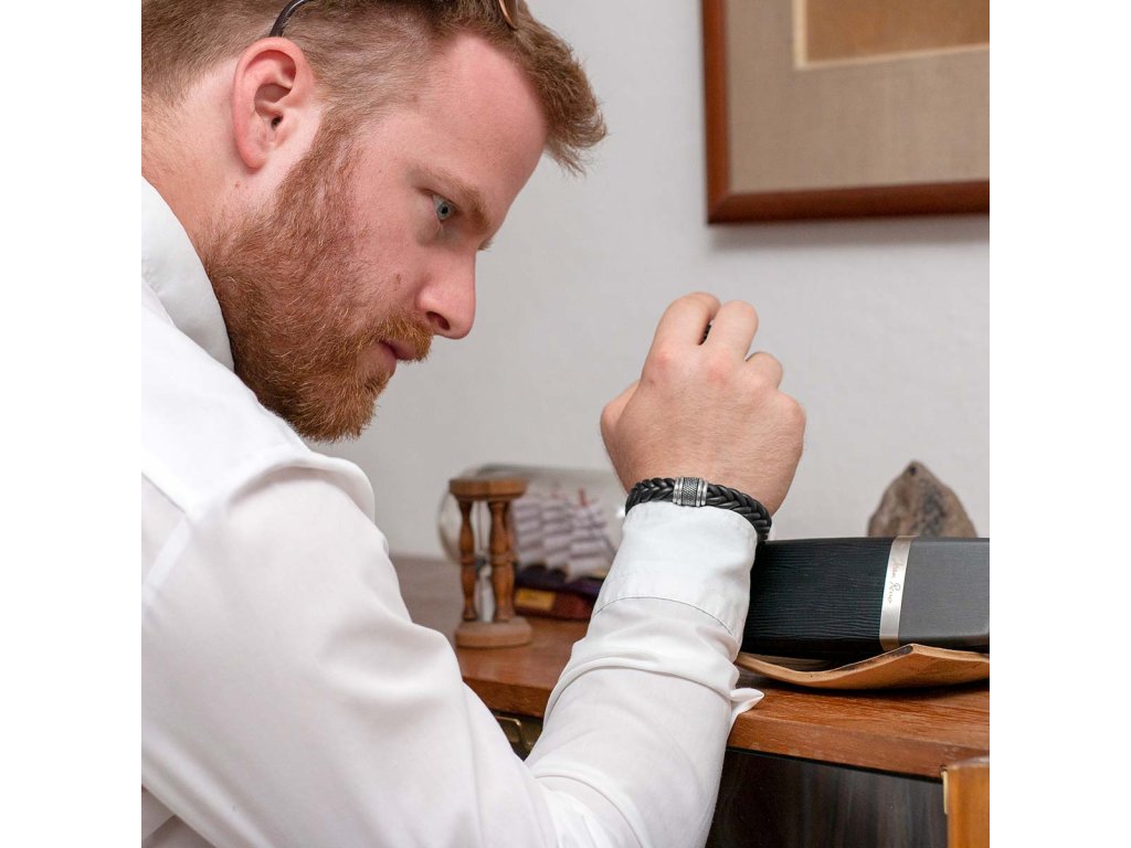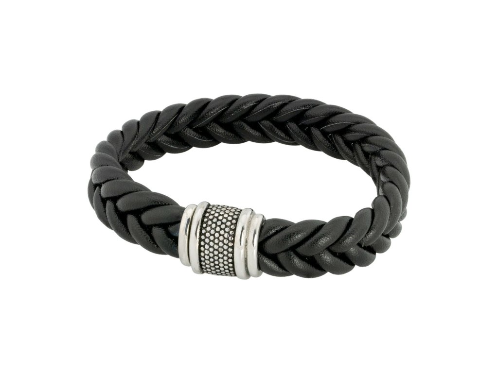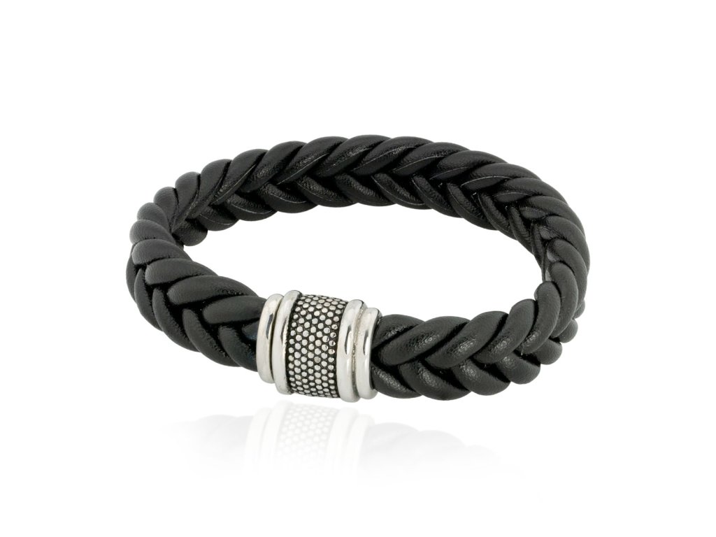 - Náramek kombinuje polomatnou kůži společně s lesklou a subtilně patinovanou chirurgickou ocelí.