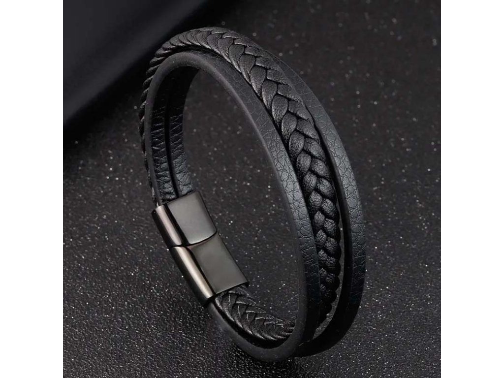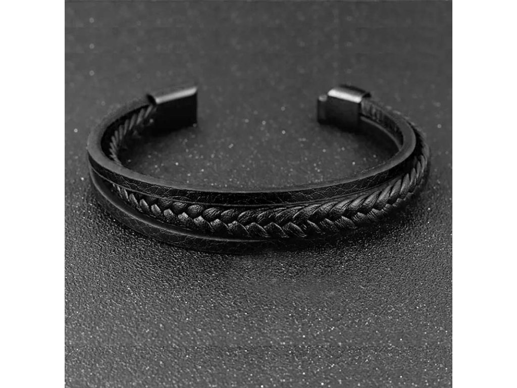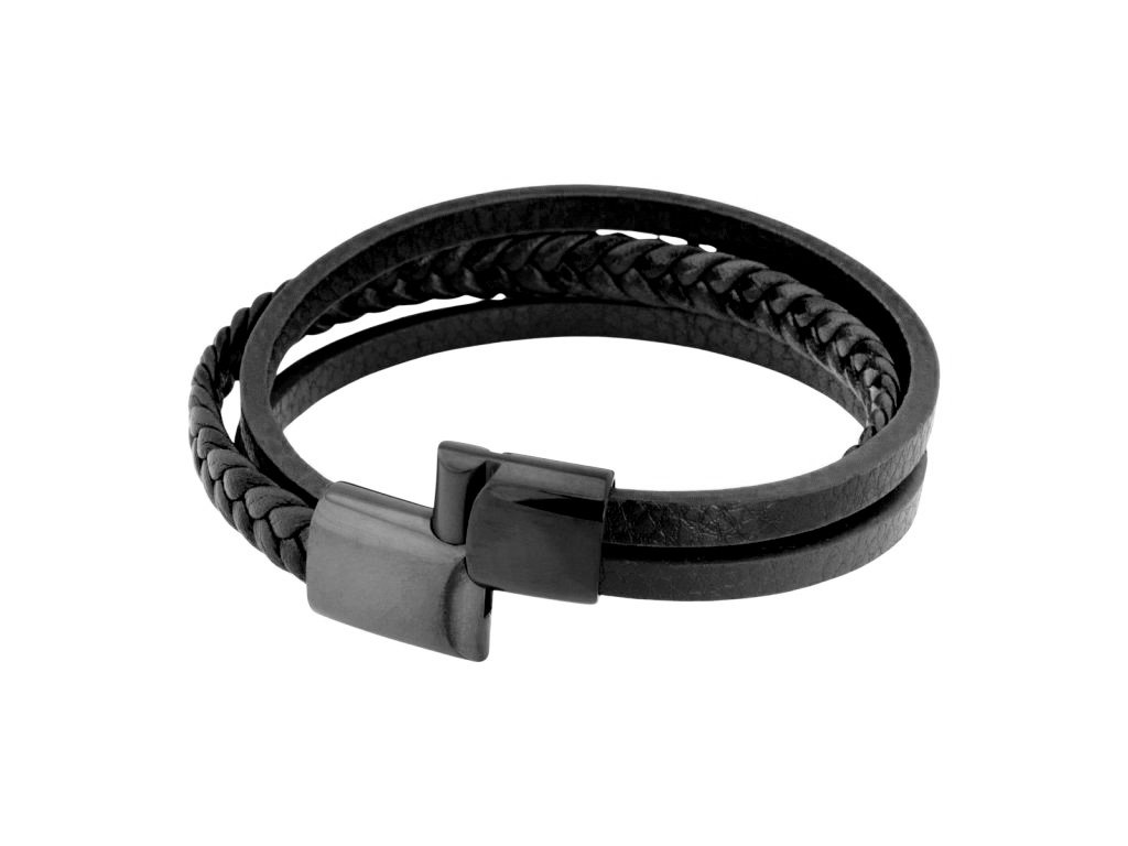 Preferujete čistě kožený náramek bez ozdob, pak je náš náramek pro vás jako stvořený. Je celý černý a tvoří jej tři pásky. Dva z nich jsou hladké řemínky s přirozenou texturou kůže. Třetí, který je nimi, je spletený z tenkých kožených pramínků kůže. Konce kůže jsou uchyceny v lesklých černých ocelových zapínacích sponách s magnetickou pojistkou. Jednoduchou krásu zvýrazňuje elegantní překřížení kožených pásků. Náramek se dá nádherně kombinovat s dalšími šperky i hodinkami. Pro svůj nadčasový design by určitě neměl chybět ve vašich módních doplňcích.