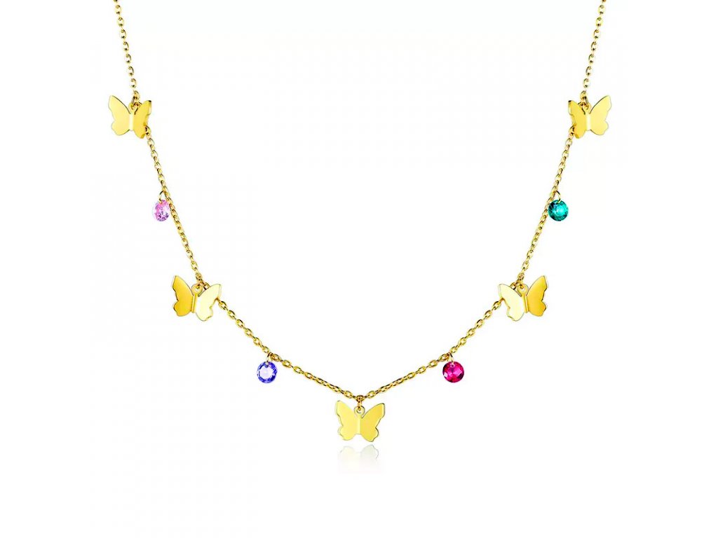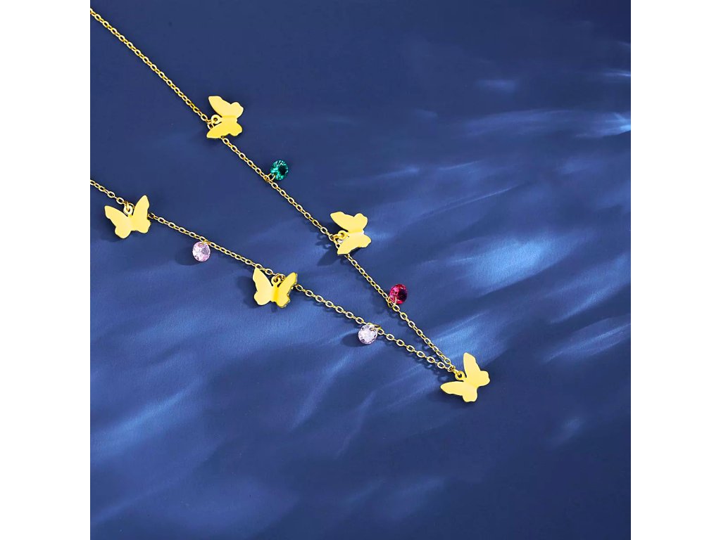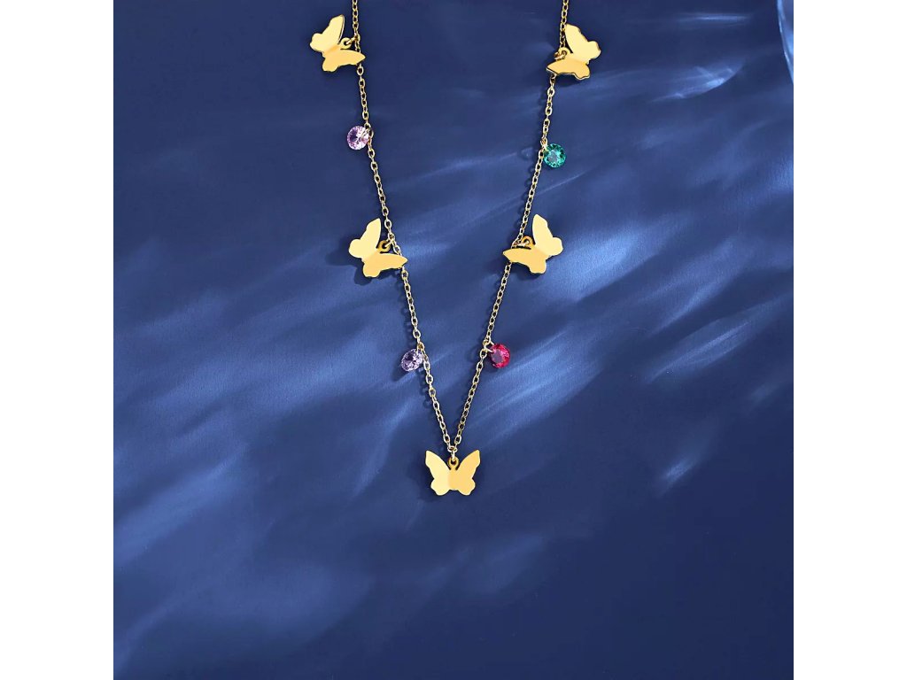 - Pět pozlacených motýlků září ve vysokém lesku a dodává náhrdelníku luxusní vzhled.