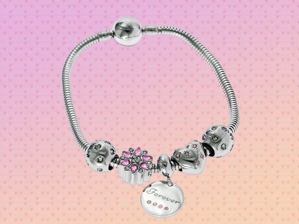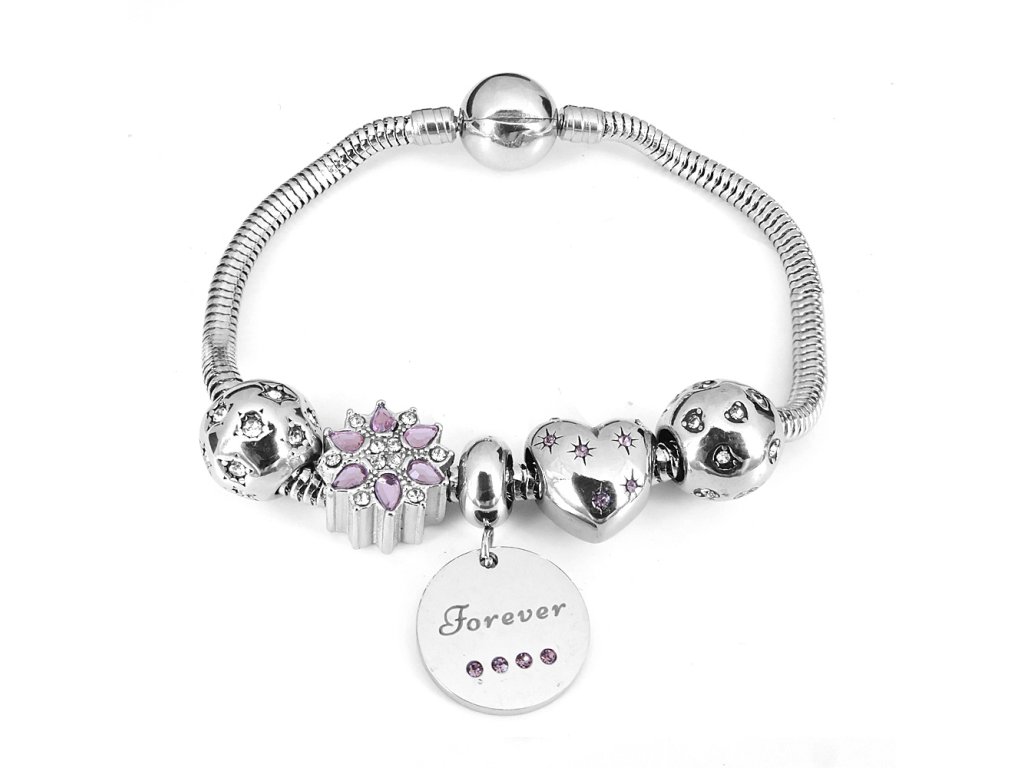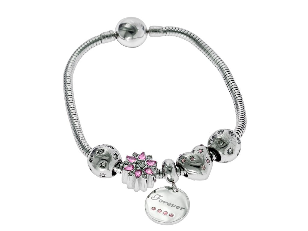 - Poslední přívěsek je placka s nápisem Forever, tedy navždy, vykládaná čtyřmi růžovými krystaly.