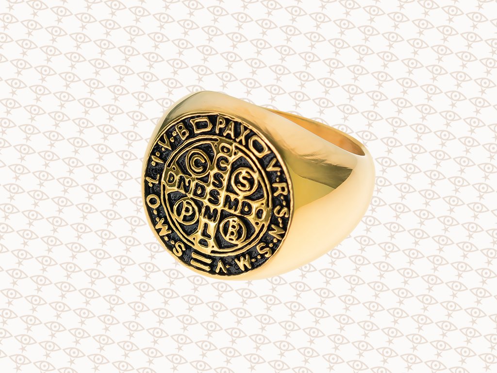 - Spíše větší prsten s výraznými symboly v lesklém zlaceném provedení v kombinaci s matným černým pokovením.