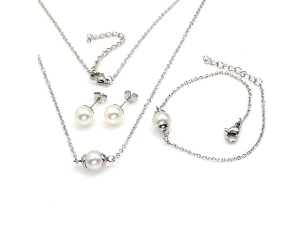 - Soupravu tvoří trendy pecky s perlou, perlový náramek a náhrdelník.